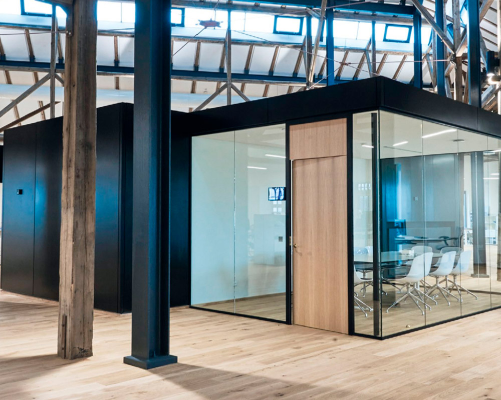 Glazed partitions are today’s preferred option for most office solutions. This is why we offer possibly the most light and elegant solutions with the highest acoustic levels and fire ratings. Our minimalistic aluminium profiles are only 25x30mm. Using acoustic glass, we start with an option of 40dB in sound reduction, the most popular option with most of our clients. Affordable and efficient.